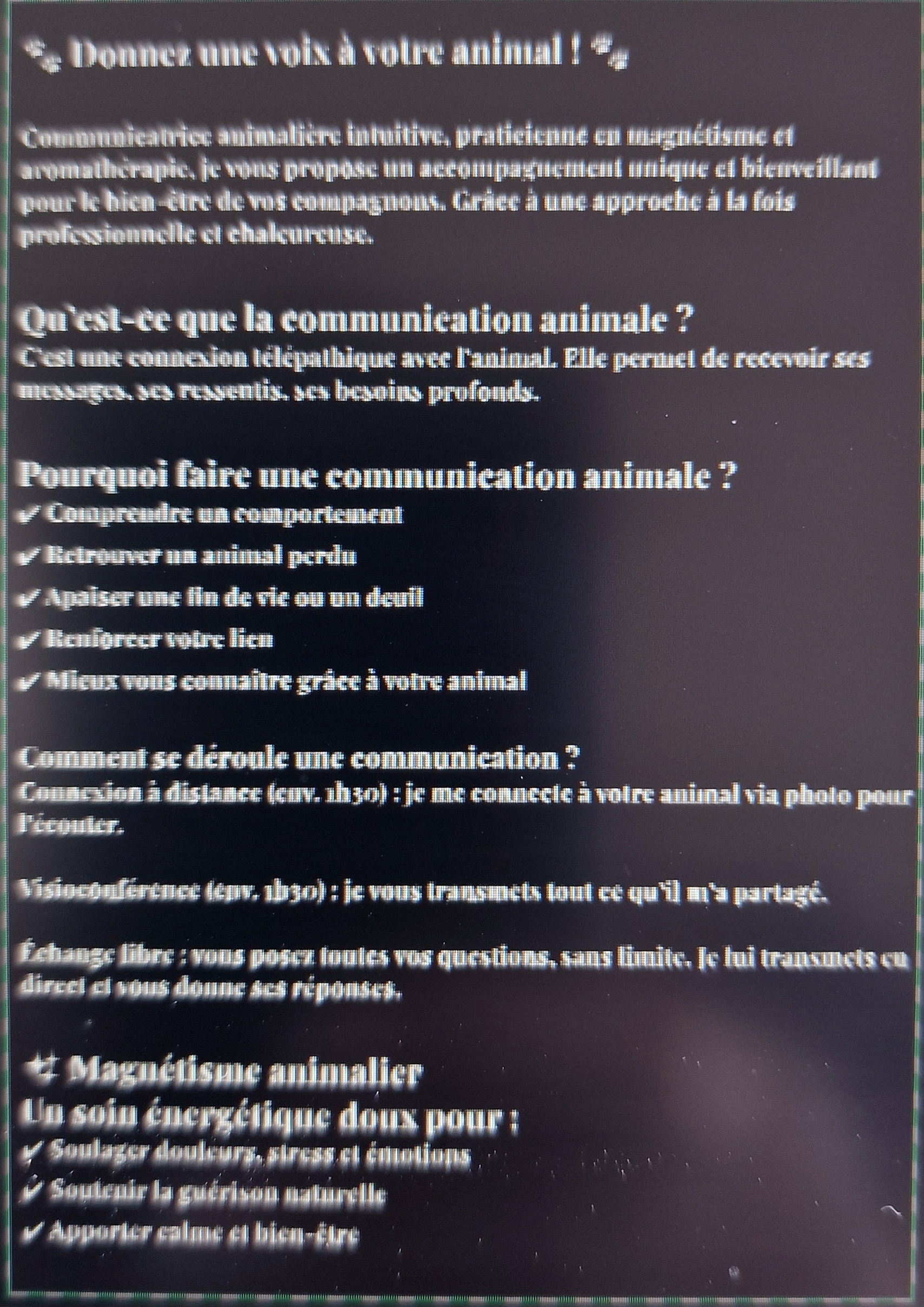 https://communication-animaliere.com/ https://www.facebook.com/communication.animale.gwhttps://www.instagram.com/ghislaine.walck/reel/DBLRrXlIka8/https://www.youtube.com/@Communication-animaliere